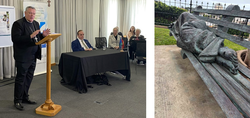 Firstly, in my Cathedral precinct in Townsville is a sculpture of the ‘Homeless Jesus’ by the well-known sculptor Timothy Schmalz. It’s a near life-size figure wrapped in a blanket and lying on a bench. The figure’s face and hands are obscured by the blanket, but his pierced feet indicate that it is a representation of Jesus.