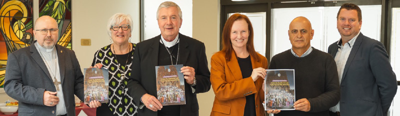 The Bishops Commission for Evangelisation, Life and Ministry include from left to right: Bishop of Port Pirie Karol Kulczycki, BCELM Executive Secretary Clara Geoghegan, Archbishop of Canberra and Goulburn Christopher Prowse, Catholic Immigration Manager for the Archdiocese of Sydney Kylie Cullen, Australian Catholic Migrant and Refugee Office national director Fr Khalid Marogi and Director of the National Centre for Evangelisation Malcolm Hart. (Image courtesy of Australian Catholic Bishops Conference.)